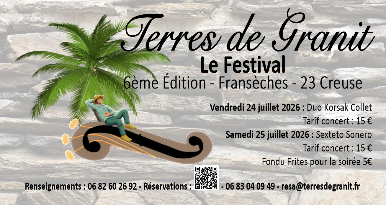 20h00 : Église de Fransèches Festival Terres de Granit Comité des Fêtes 09h00 : Salle des Loisirs Festival Terres de Granit Comité des Fêtes |